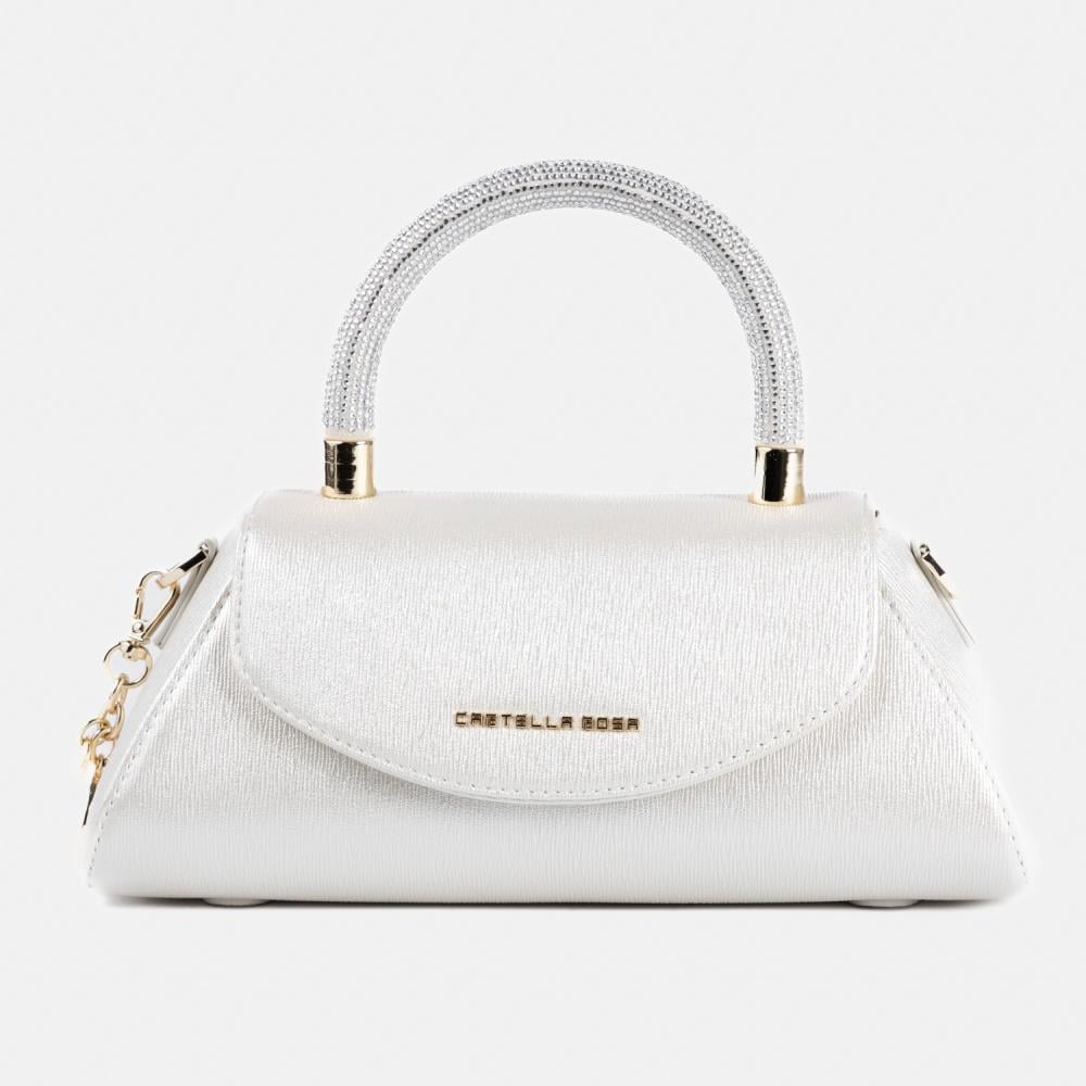 تصميم فاخر بلمسة لامعة: لونها الفضي المضيء يعكس الإضاءة بشكل ساحر، مع مقبض يد مرصع بالكريستال يضفي أناقة فريدة على مظهرك.