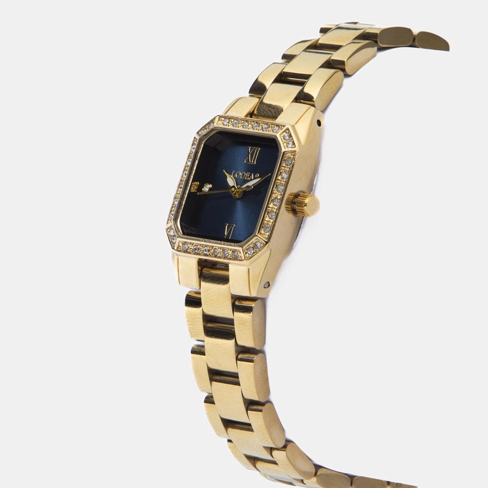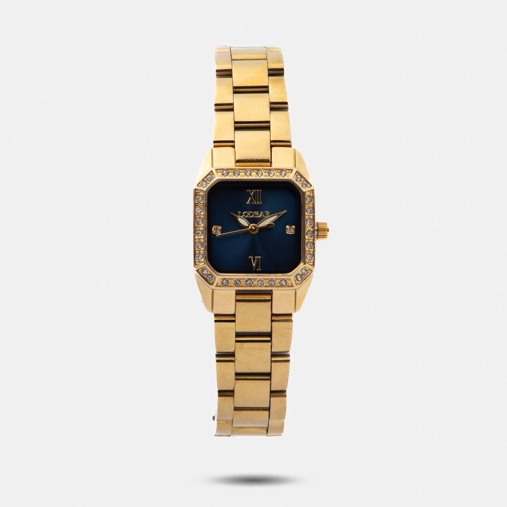 • ساعة نسائية بإطار مربع ومرصع بالكريستال باللون الذهبي وميناء باللون الازرق