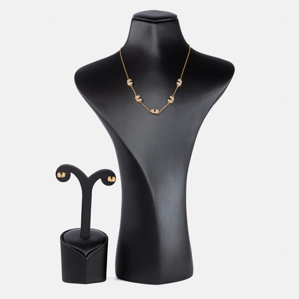 تميّزي كل يوم بطقم مجوهرات أنيق يبرز جمالك الطبيعي بتصميم عصري فريد. يتكون الطقم من سلسال راقٍ مزين بقطع لامعة متناغمة، يرافقه زوج من الحلق الأنيق صغير الحجم ليمنحك لمسة ناعمة وجذابة في الوقت نفسه.
