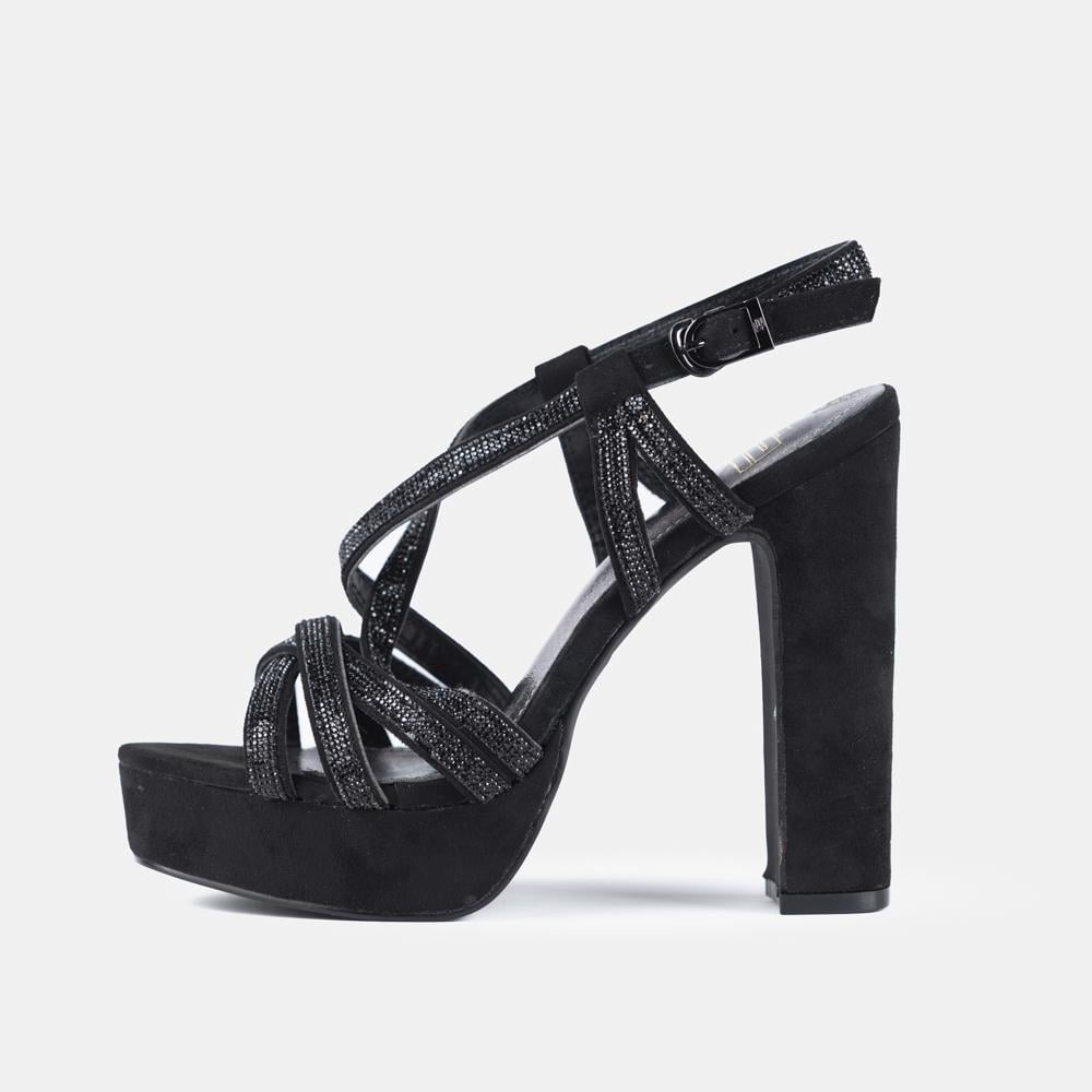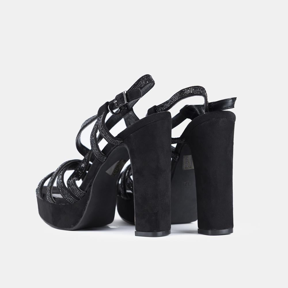يأتي هذا الحذاء بكعب عريض بارتفاع 12.5 سم يمنحك الطول والثقة، مع حزام أنيق مزين بفصوص لامعة تضيف بريقاً خاصاً إلى كل خطوة.