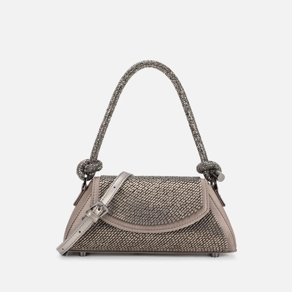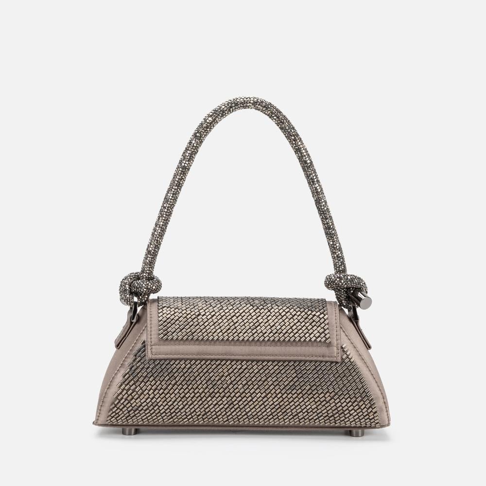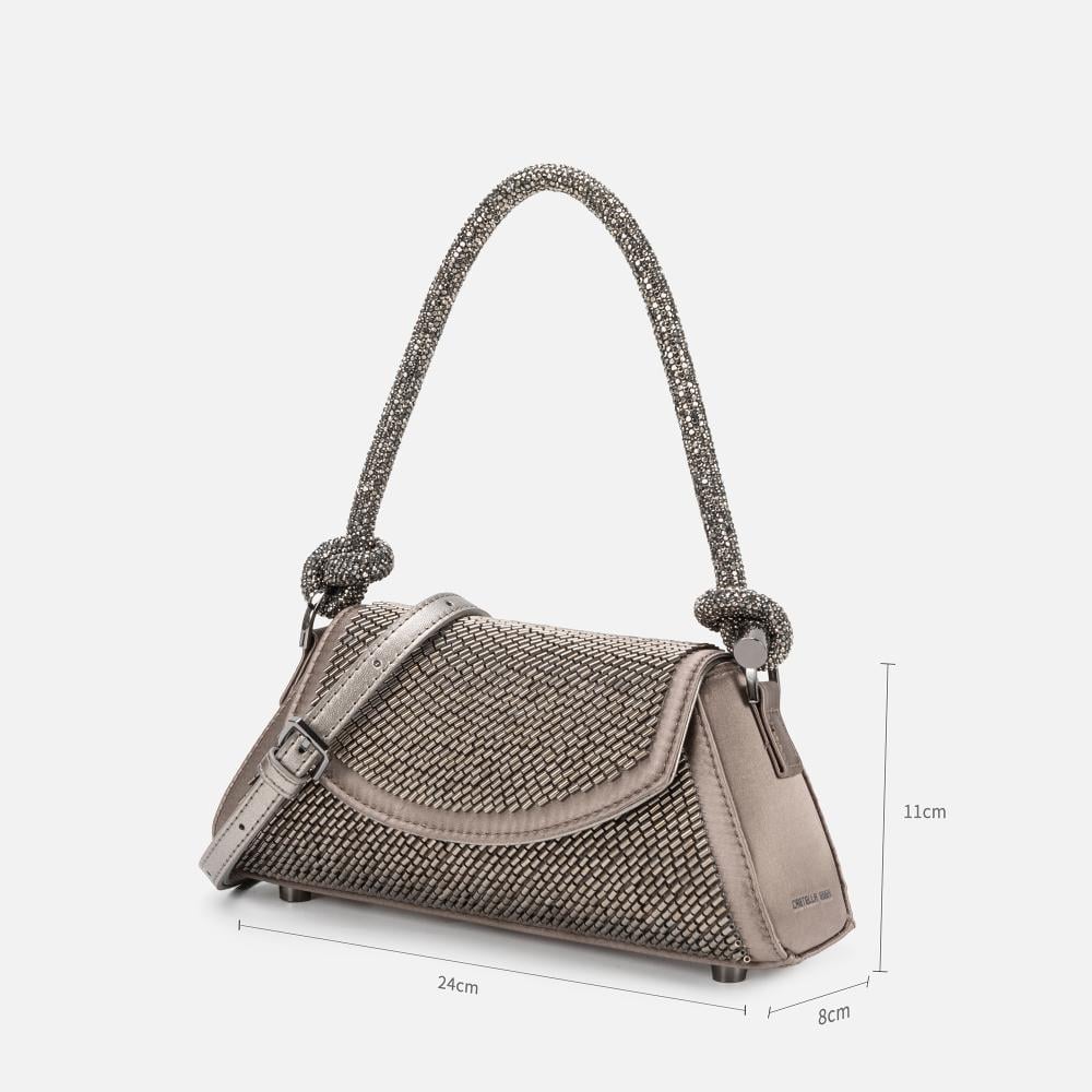 - شنطة من الجلد اللامع مع قواعد سفلية لتثبيت الشنطة ومقبض يد ثابت مرصع بالكريستال