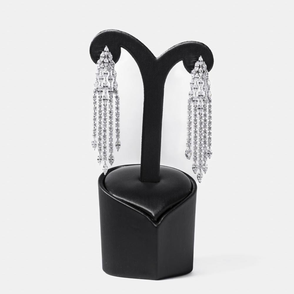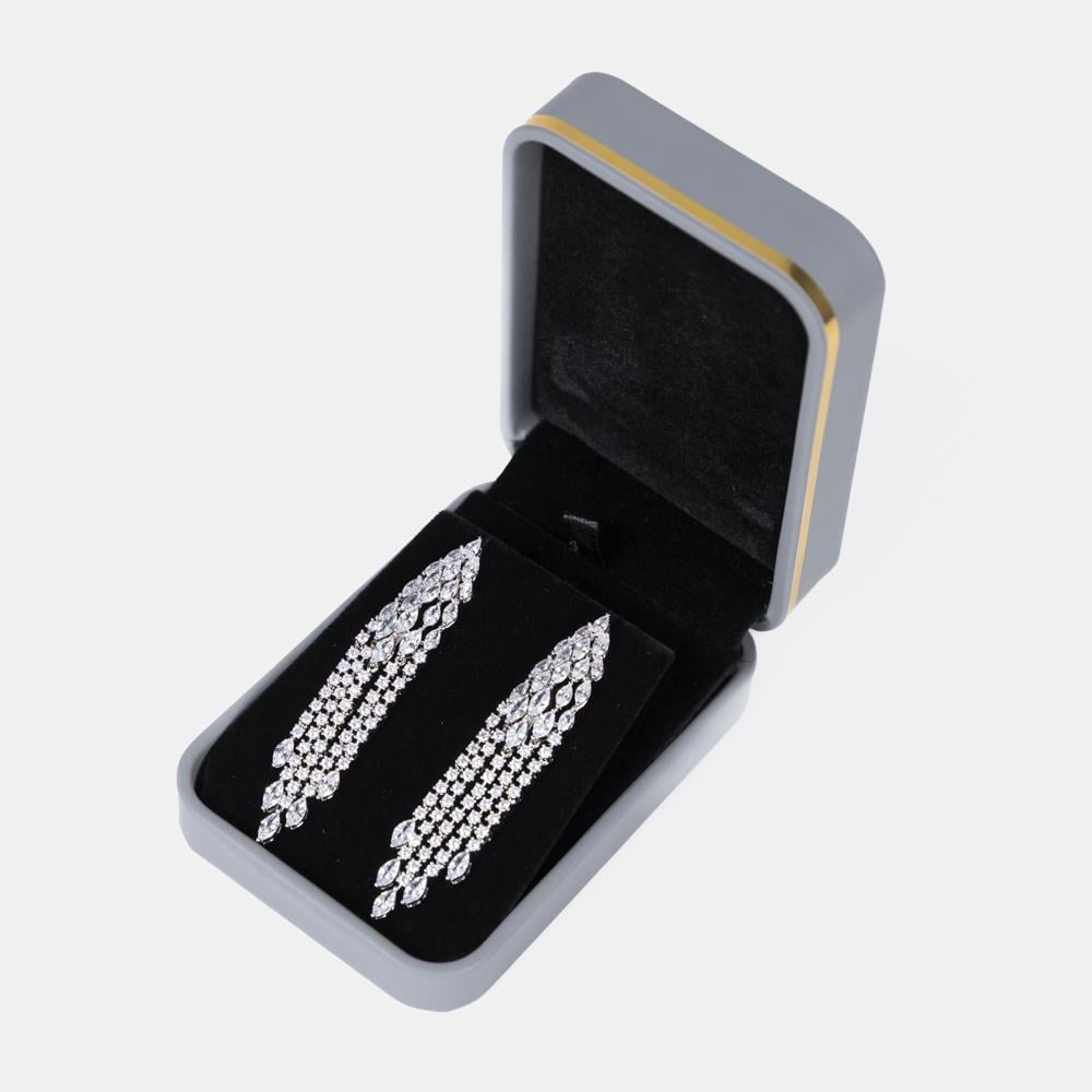 - حلق طويل من الزركون باللون الفضي بكريستاله كبيرة ينسدل منها عدد من الكريستالات الاصغر بأطوال مختلفه ولمعه جذابة