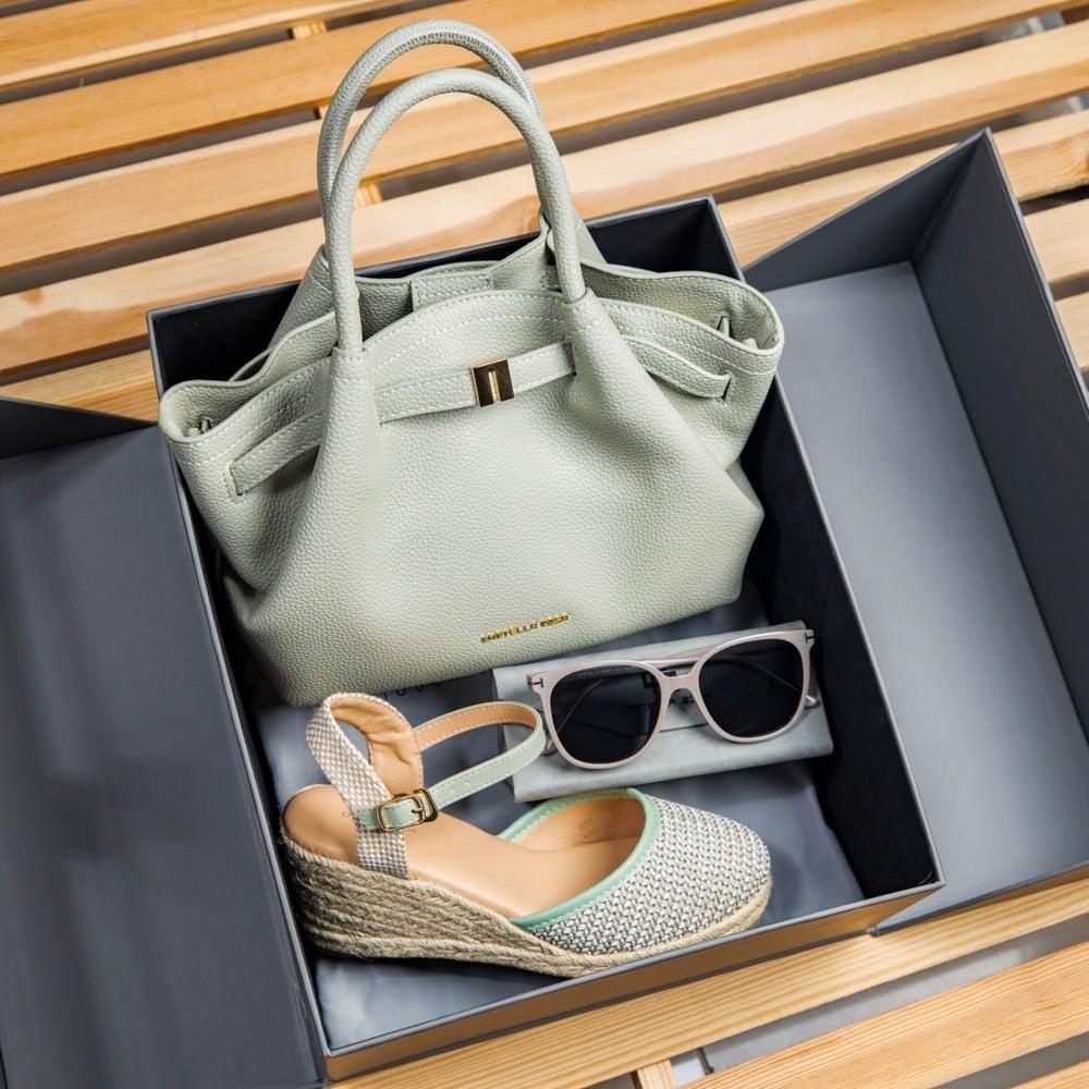حقيبة جلدية بلون أخضر فاتح راقٍ بتصميم أنثوي فاخر وحرفية عالية، تضيف لمسة من الأناقة الهادئة إلى إطلالتك اليومية أو المسائية.