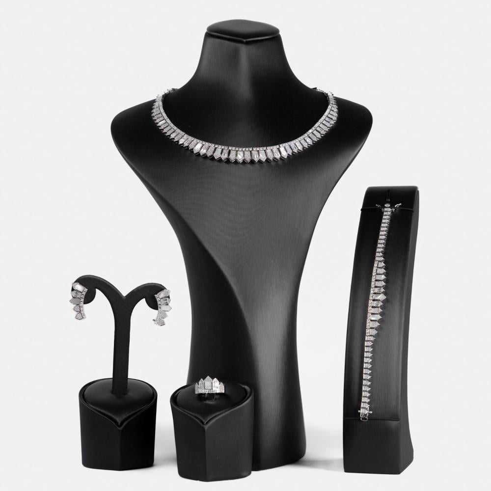 صُمم هذا الطقم الساحر ليبرز أنوثتك ويضفي لمسة من الرقي على إطلالتك في كل مناسبة. ببريقه الذي لا مثيل له وتصميمه العصري، ستكونين محط الأنظار أينما ذهبتِ.