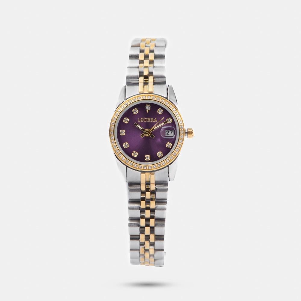 - ساعة نسائية بإطار دائري باللون الذهبي والفضي وميناء باللون البنفسجي